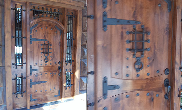 For this exterior residential project, we stained and varnished this gorgeous exterior door working around the intricate wrought iron fixtures.