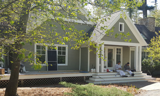 For this exterior residential project, we painted the trim, soffits, window casing and step fronts in white and all the siding in a blue-grey.