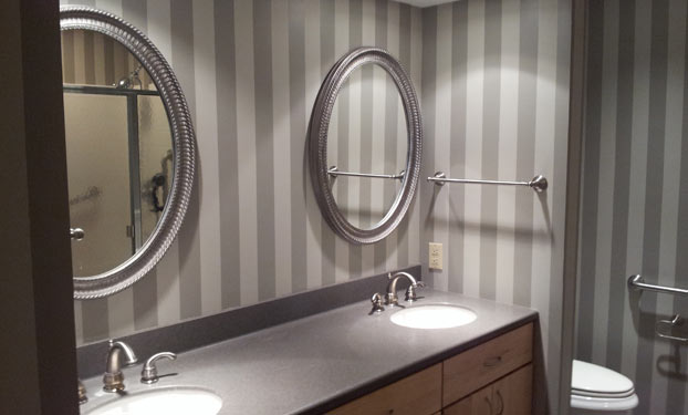 For this interior residential painting project, we applied a striped pattern to the walls of this restroom. The result looks like wallpaper but it's all paint.
